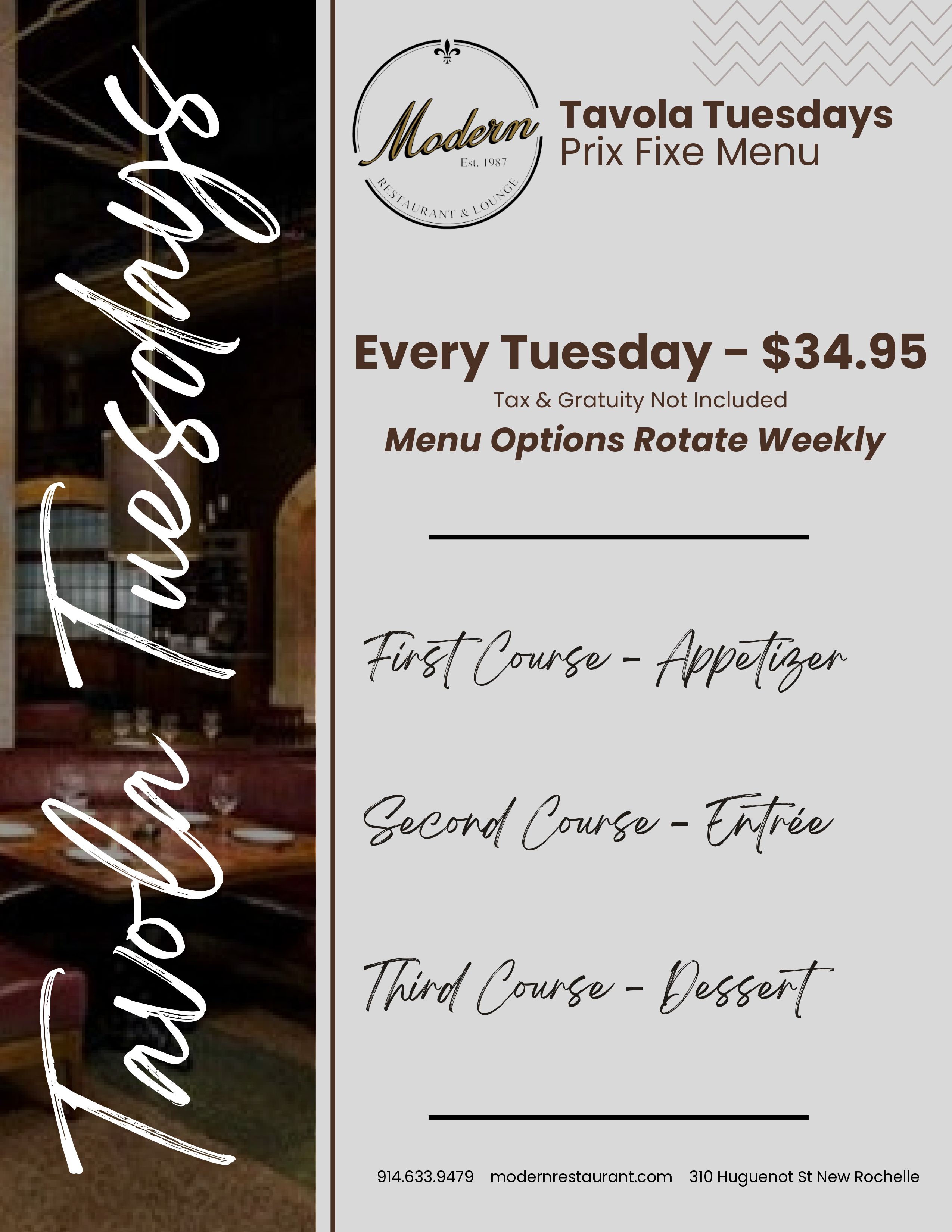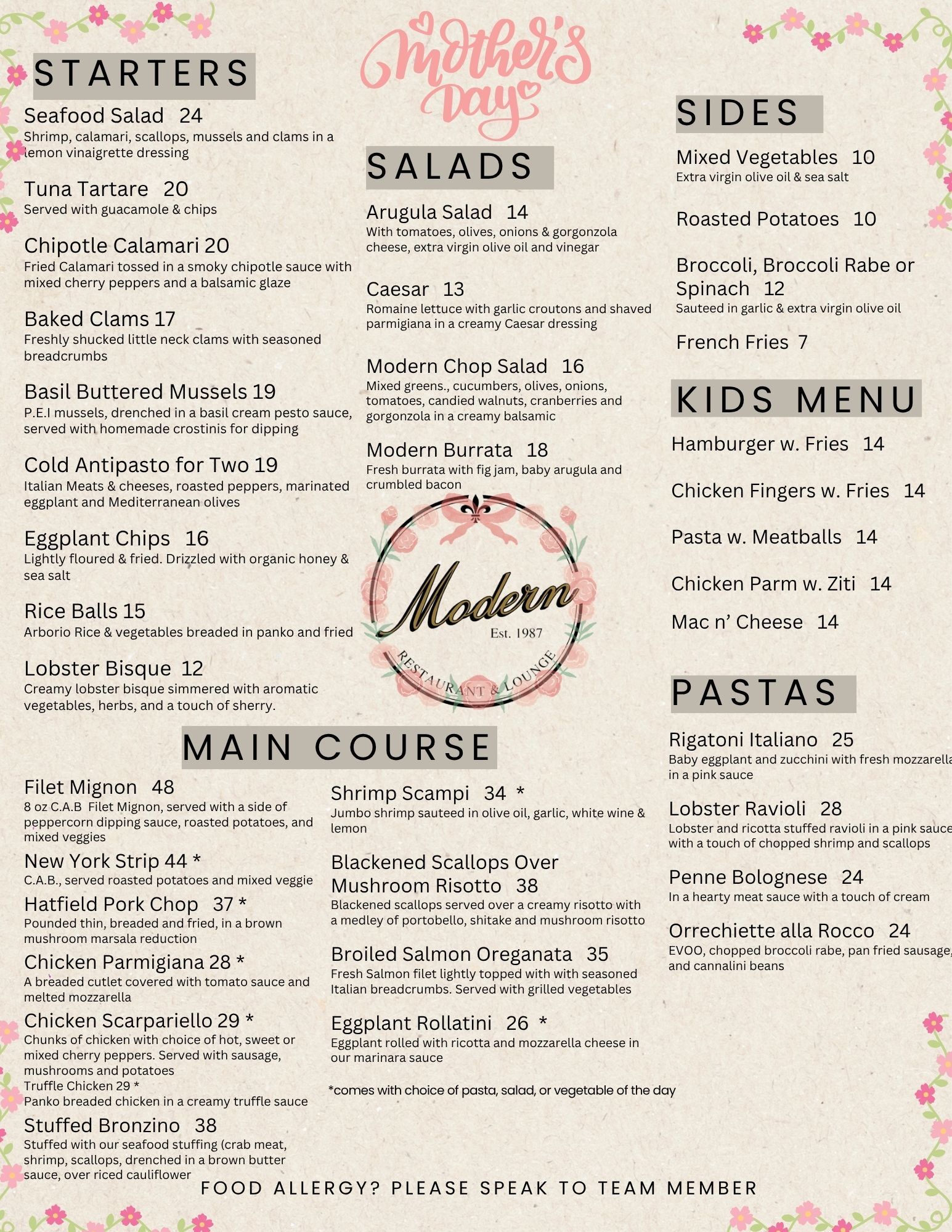OrderCome see what everyone is talking about and enjoy a wonderful meal in our beautiful venue. Bring your family in to meet our family and experience the tradition, history and good taste at Modern Restaurant and Lounge.